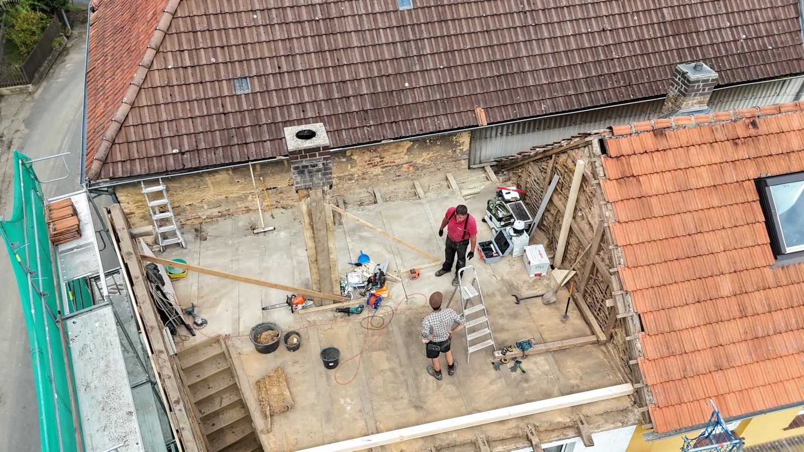 Ein zentraler Bestandteil der Arbeiten war die Erneuerung der Dachkonstruktion des Anbaus. Nach dem fachgerechten Rückbau haben wir einen komplett neuen Dachstuhl errichtet. Um modernsten energetischen Standards zu entsprechen, wurde eine vollflächige Aufsparrendämmung verlegt. Diese Konstruktion schützt das Gebäude im Winter vor Kälte und im Sommer vor Hitze.