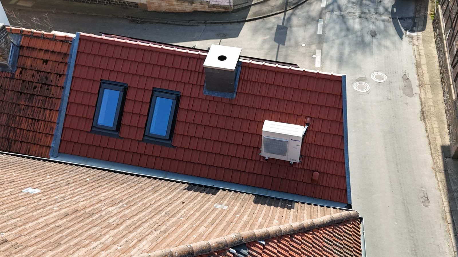 Die Hauptdachfläche wurde mit zeitlosen, leuchtend roten Dachziegeln neu eingedeckt, die perfekt mit der neuen Holzverschalung am Giebel harmonieren. Für mehr Tageslicht im Innenraum sorgte der Einbau moderner Dachflächenfenster. Die handwerkliche Qualität zeigt sich auch in den Details: Der Schornstein wurde passgenau mit langlebigem Naturschiefer verkleidet und mit einer neuen Haube versehen. Zudem haben wir eine Montagekonsole für die Außeneinheit der Klimaanlage sicher in die Dachfläche integriert.